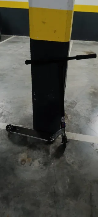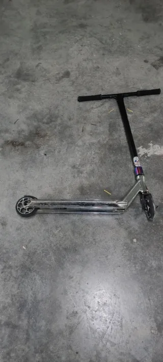 Patinete de trucos de alta calidad, ideal para la pista. - Diseño plateado y negro. - Ruedas resistentes.