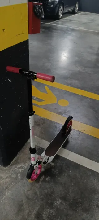 Patinete de paseo con un diseño moderno y llamativo. - Color blanco con detalles en rosa. - Ruedas delanteras y traseras. - Manillar ajustable.