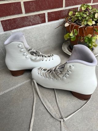Se venden patines blancos de patinaje artístico. Sin la armadura para las ruedas. - Diseño alto para soporte del tobillo. - Cordones blancos. - Suela de color marrón.