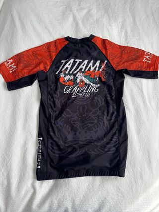 Rashguard de manga corta de la marca Tatami Fightwear. Presenta un diseño llamativo con un estampado de tigre en la parte trasera y detalles en naranja en las mangas. - Diseño de tigre. - Mangas con estampado. - Talla S.