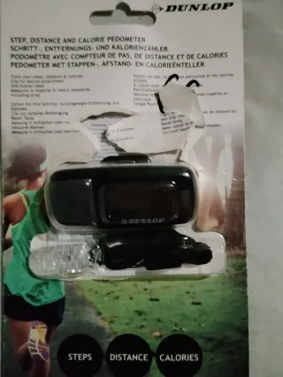 Pedometer Dunlop para contar pasos, distancia y calorías. - Clip para sujeción segura. - Medidas en estándares imperiales y métricos. - Incluye correa.
