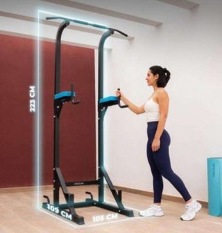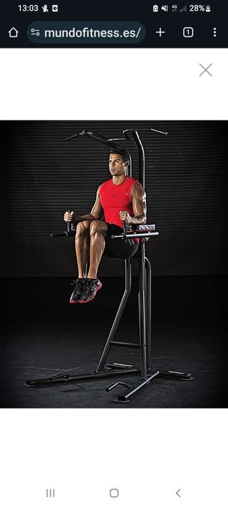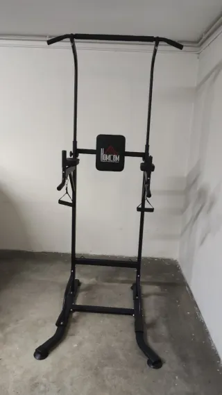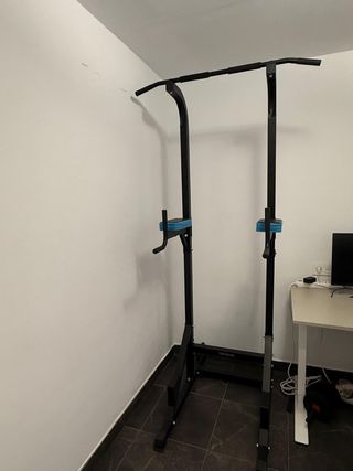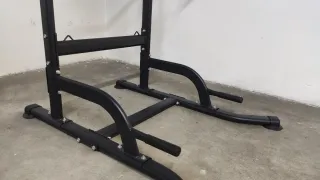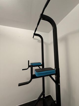 Power tower de alta calidad, se puede regular la altura en 6 niveles y el respaldo tiene 7 posiciones. Soporta hasta 450 libras (204kg) que a diferencia de otras es muchísimo más y a penas se tambalea al hacer dominadas y los brazos tienen una inclinación hacia el interior que ayuda a la hora de hacer elevaciones de piernas. Tiene más de 15000 ventas en Amazon y un 4,4 de valoración, me costó 300€ Tiene el respaldo y uno de los brazos un poco arañado porque mi gato se subía y tiene marcas de las uñas Si alguien quiere le puedo pasar el link de Amazon para que vea las valoraciones y el producto Barra para dominadas pull ups
