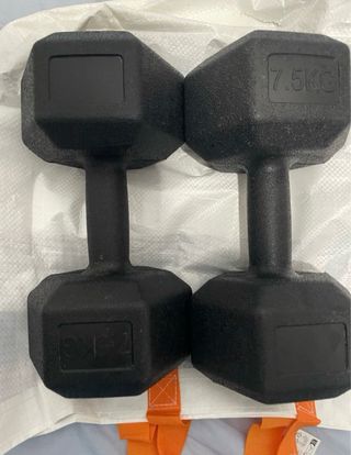 Par de mancuernas hexagonales de 7.5 kg cada una. Ideales para entrenamientos de fuerza. - Diseño hexagonal para evitar que rueden. - Recubrimiento de goma para mayor agarre y protección. - Peso: 7.5 kg por mancuerna.