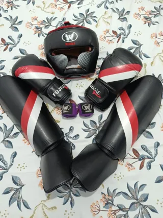 Conjunto de protecciones para la práctica de kickboxing. - Casco protector negro y rojo Rox Large - Guantes de boxeo - - Espinilleras negras y blancas - Protecciones para los pies -Coquilla -Protector bucal opcional, se puede desinfectar y volver a usar Se puede vender por separado