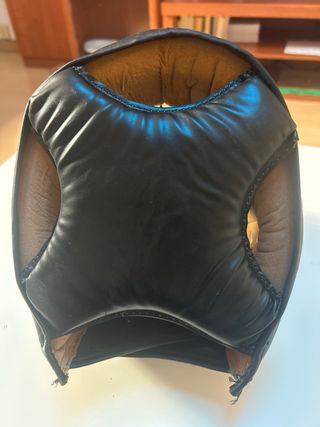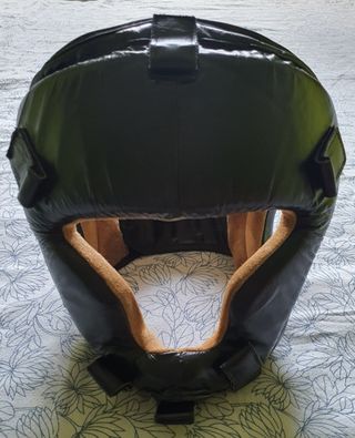 Casco de boxeo con barra de protección frontal y protección en los oídos. Piel. Talla única, puesto que se adapta con cordones a cada cabeza. Comprado el 9 de enero de 2025. Está sin usar, a estrenar y con su ticket de compra ( 85€), por lo que tendría casi dos años de garantía. Es de piel. Se incluye un líquido eliminador de olores que nos proporcionaron con la compra del casco. Proporciono el ticket de compra para la garantía. El precio ha sido de 85 euros. Se incluye también un saquito de tela con el que venía.