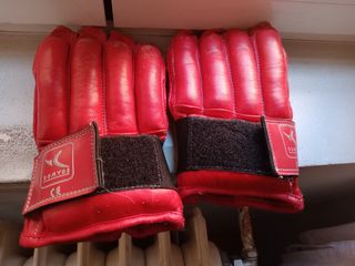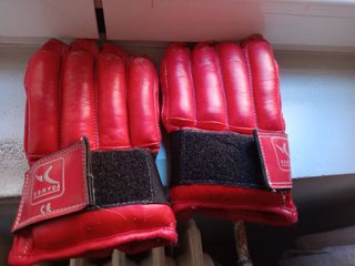 Par de guantes de boxeo y krav maga marca DAN BOXING. - Color rojo y blanco. - Cierre de velcro. - 12oz - solo 2 puestas. Tengo las protecciones de las espinillas. Nuevos valen 40€