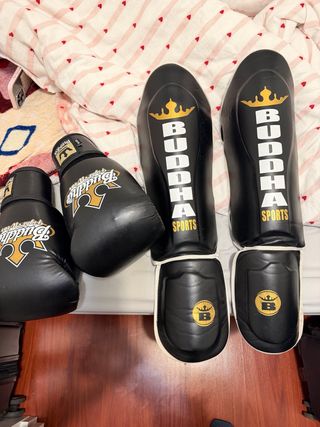Conjunto de equipo de Muay Thai de la marca Buddha. - Guantes de boxeo negros 16Oz - Espinilleras negras con protección talla L - Diseño con logo dorado de Buddha Sports.