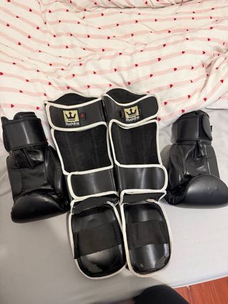 Conjunto de dos pares de espinilleras talla L/XL (unas de ellas con protección de pie) y guantes de boxeo de 12 oz. En buen estado. Una de las espinilleras están sin estrenar.