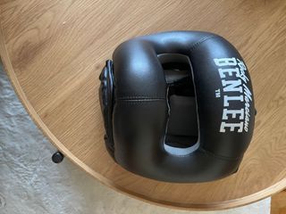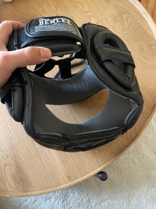 Casco de boxeo de la marca Benlee en color negro. Se ha utilizado una sola vez. - Material exterior de cuero sintético. - Acolchado interior para mayor protección. - Cierre ajustable.