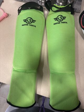 Protecciones para las piernas de la marca Custom Fighter, ideales para kickboxing. - Color verde lima. - Diseño ergonómico. - Cierre con tiras ajustables.