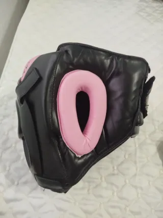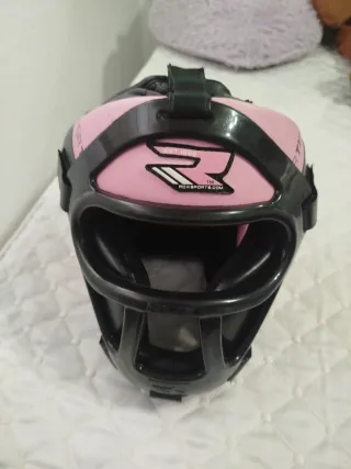 Casco de protección RDX para boxeo o kickboxing. Diseño en color rosa y negro. - Talla M. - Marca RDX. - Logo de la marca visible. - Cierre ajustable con velcro.