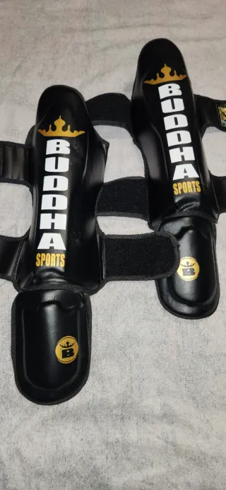 Protecciones para Muay Thai de la marca Buddha Sports. Color negro con detalles dorados. - Se han usado en 4 ocasiones en entrenamiento suave. - Diseño ergonómico. - Cierre de velcro ajustable. - Logotipo de la marca en blanco y dorado. - Talla S