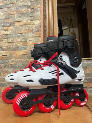 Patines en línea oxelo talla desde la 32 a la 35. Tiene leves marcas de uso como se ve en las fotos.Mi hijo apenas los ha usado cuatro o cinco veces. Los envío con una bolsa ligera Decathlon y regalo protecciones de oxelo valoradas en 20 euros.