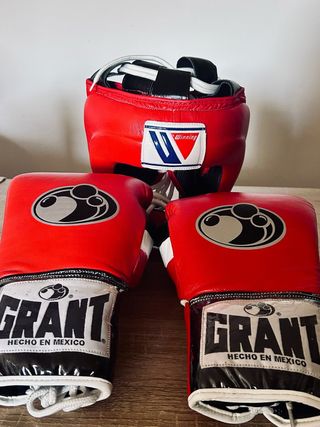 Kit de boxeo profesional que incluye guantes y casco. - Guantes de boxeo marca Grant, hechos en México. - Casco de protección marca Winning.