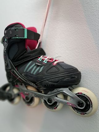 Set completo de patines en línea Oxelo, ideal para disfrutar del patinaje. - Patines en línea Oxelo negros y rosas. - Incluye juego de protecciones (muñequeras, coderas y rodilleras) con diseño floral. - Bolsa de transporte Oxelo gris y azul.