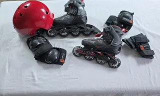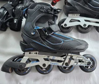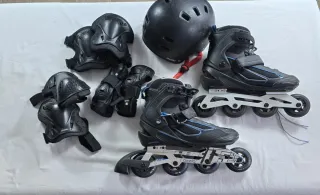Conjunto completo para patinaje, ideal para iniciarse o para quienes buscan seguridad. - Patines en línea Oxelo negros con detalles azules. - Juego de protecciones: rodilleras, coderas y muñequeras. - Casco de protección negro.