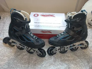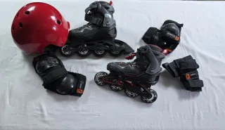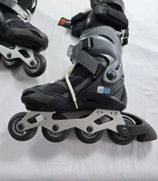 Patines en línea Rollerblade en talla 42. Se encuentran en perfecto estado, listos para usarse. inclullo casco y protecciones - Diseño en color negro con detalles plateados. - Cierre de velcro y hebilla para un ajuste seguro. - Ruedas de alta calidad.