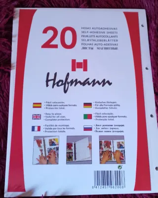 Paquete de 20 hojas adhesivas de la marca Hofmann. A ESTRENAR CON EMBALAJE ORIGINAL SIN ABRIR - Fáciles de colocar. - Válidas para cualquier tamaño de foto. - Ofrecen protección total. - Ideales para montaje. - Válidas para todos los formatos. - Protección completa. Se entrega en persona Visita mi página para ver otras ofertas
