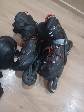 Patines en línea en color negro con detalles en naranja. Ajustables para tallas 35 a 38. - Cierre con cordones, velcro y hebilla. - Ruedas de poliuretano. - Incluye protecciones (rodilleras, coderas y muñequeras).