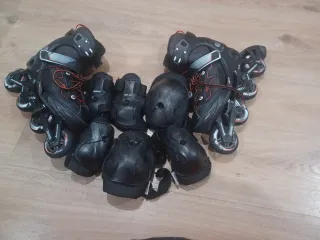 Patines con poco uso. Uno de los patines tiene pegado un ade las tiras pero sigue funcionando. Se regalan las protecciones.