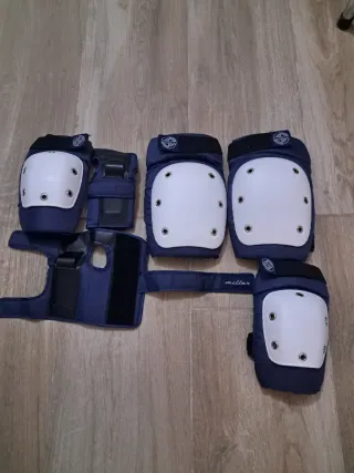 Set de protecciones Miller para patinaje o deportes de riesgo. Incluye rodilleras, coderas y muñequeras. - Color azul marino. - Cierre de velcro ajustable. - Diseño ergonómico.