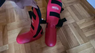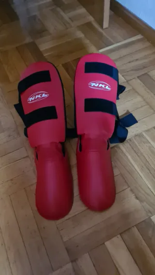 Espinilleras de protección para deportes de contacto como Muay-Thai Kick Boxing o MMA. Son de color rojo y tienen el logo de NKL. - Cierre con velcro. - Material resistente. Talla XL