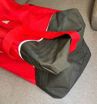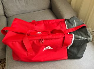 Bolsa de deporte unisex Adidas. Espaciosa y diseño extra resistente. Semirrígida. Talla L Dimensiones: 70 cm x 32 cm x 32 cm Tejido técnico 100% poliéster. Bolsillo lateral con cremallera y ventilación para las zapatillas. Bolsillo malla lateral exterior. 3 bolsillos interiores. Asa de mano superior y correas para los hombros con forro de malla. Tacos de protección en la base. Color del artículo: Rojo, negro y blanco. Tiradores de cremalleras grabadas con logo adidas. Observar la autenticidad del artículo en los detalles de las cremalleras, etiquetado y tacos.