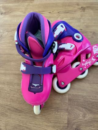 Patines en linea decathlon oxelo niña talla s 30-32 ,más casco color rosa claro y protecciones de manos blancas y negras de codos, todo en buen estado solo con algunas marcas y rozaduras de su uso ya que los vendo por cambio de talla . Más artículos de hogar y otros en mi perfil , hago precio por lote .