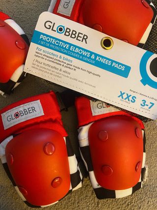 Set de protección Globber para codos y rodillas, talla XXS (3-7 años). - Diseñado para scooters y bicicletas. - Fabricado en nylon de alta calidad con correas de velcro. - Color rojo con diseño a cuadros.