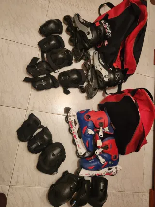 Se venden dos pares de patines en línea, uno talla 34-36 y otro talla 36-al 38 Incluyen protecciones. - Patines talla 34-36. - Patines talla 36_38 - Juego de protecciones para rodillas, codos y muñecas.