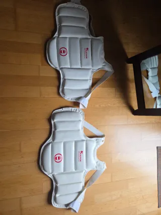 Peto protector de karate en color blanco. Diseñado para ofrecer protección durante la práctica de artes marciales. - Material acolchado. - Correas ajustables para un buen ajuste. SE VENDEN JUNTOS 20EU O POR SEPARADO 25EU Talla S