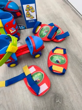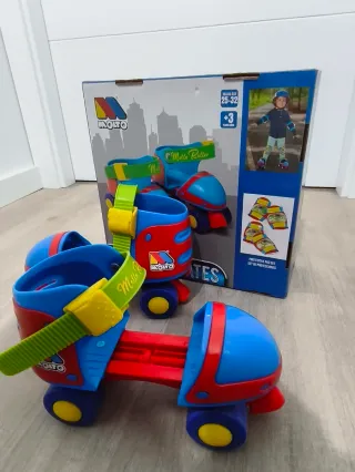Set de patines infantiles Molto en su caja original, ideal para iniciarse en el patinaje. - Talla: 25-32. - Incluye set de protecciones (rodilleras, coderas y muñequeras). - Edad recomendada: +3 años. - Diseño en colores rojo, azul y amarillo.