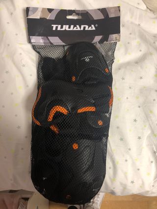 Set de protecciones de la marca Tijuana para patinaje. - Protección completa - Color negro con detalles naranjas. - Cierre de velcro ajustable. Algunas están un poco ralladas del uso, pero por lo demás todo perfecto