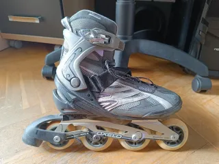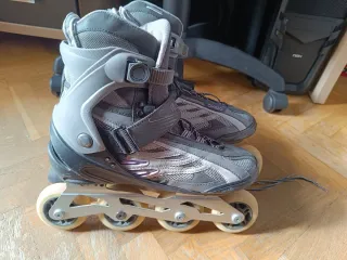 Patines en línea Oxelo en muy buen estado, talla 40 (25 cm). No son ajustables. Ruedas 76 mm 78A, freno trasero y cierres seguros (cordones + velcro + hebilla). Incluye: - Set completo de protecciones (muñequeras, coderas y rodilleras). - Mochila Oxelo para transportar los patines y el equipo. Todo limpio, cuidado y listo para usar. Ideal para iniciarse o retomar el patinaje. Entrega en zona Pirámides (Madrid).