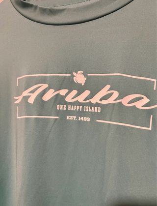 Camiseta de manga larga con diseño de Aruba, ideal para protección solar. El color es un tono verde azulado. Camiseta de protección solar marca Momentum. Muy finita y fresca. Talla L - Diseño Aruba The Happy Island Est. 1498 en blanco. - Cuello redondo. - Manga larga.
