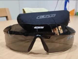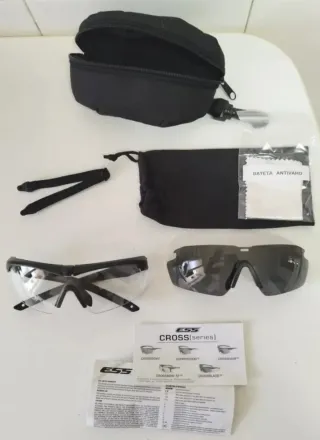 Set de gafas de protección ESS con lentes intercambiables. Incluye: - Funda rígida y funda blanda, ambas en color negro. - Dos (2) pares de lentes: transparentes y ahumadas. - Cinta elástica para sujeción a la cabeza. - Paño de limpieza antivaho. Perfecta paa prácticas de Airsoft, para la caza...