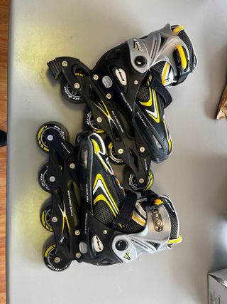 SE USARON 2 VECES PERFECTO ESTADO Se venden patines en línea talla 39 (24 cm) junto con casco y protecciones. - Patines de cuatro ruedas. - Casco amarillo. - Incluye protecciones talla M