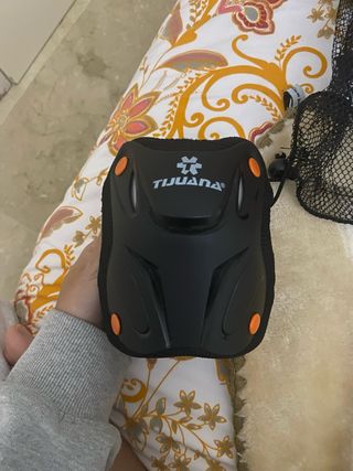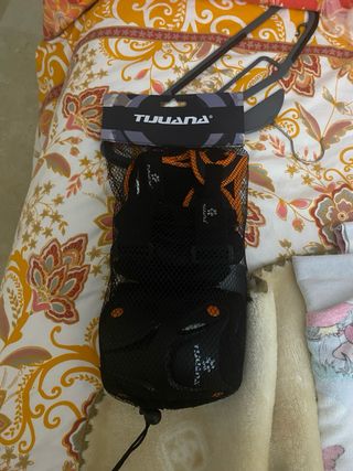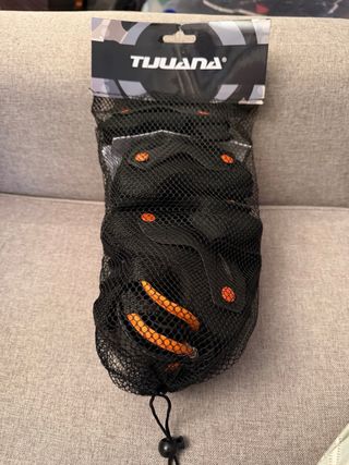 Set de protecciones para patinaje de la marca Tijuana. Incluye rodilleras, coderas y muñequeras. Talla S-m - Color negro con detalles naranjas. - Incluye bolsa de malla para guardarlas.