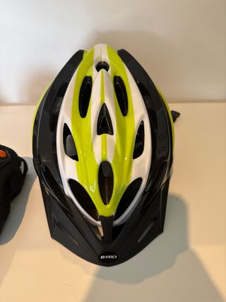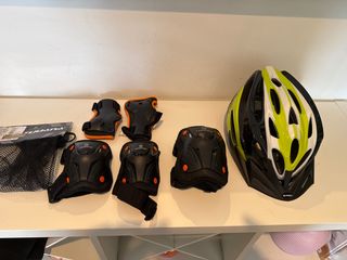 Set completo de protecciones para patinar, incluye casco y rodilleras/coderas. Talla: S/M - Casco de ciclismo con ventilación. - Juego de 6 protecciones (2 rodilleras, 2 coderas, 2 muñequeras). - Color negro con detalles naranjas y lima.