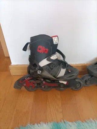 Se venden patines en línea para niños, talla 32-34. Incluyen protecciones para mayor seguridad. - Diseño en negro y rojo. - Cierre de velcro y hebilla