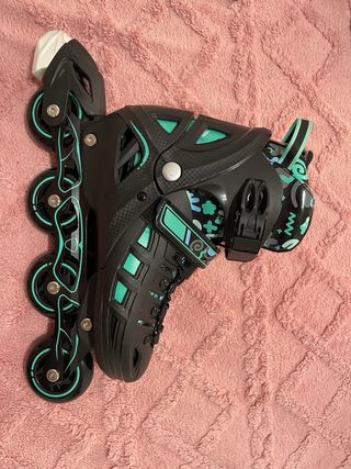 Set de patines en línea negros con detalles en color verde menta, ideales para iniciarse en el patinaje. Incluye protecciones para mayor seguridad. - Patines ajustables. - Incluye rodilleras, coderas y muñequeras. - Diseño con hebillas y cordones para un ajuste seguro. - Ruedas de poliuretano.