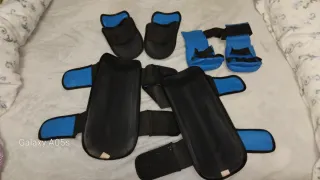 Set de protecciones para artes marciales en color azul. - Incluye espinilleras y guantes. - Marca NKL. - Material homologado.