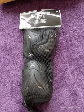 Conjunto compuesto de Rodilleras, Coderas y Muñequeras. Espuma EVA con forro de malla, tapas de PP de alto impacto, correas elásticas ajustables con cierre de velcro. Talla S: Talla de zapato 28-31. En perfecto estado, poco uso