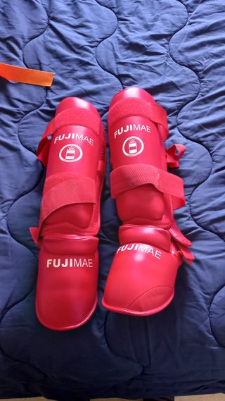 Vendo protecciones de karate de la marca Fuji Mae, talla S. Son de color azul y parecen estar en buen estado. - Incluye un par de espinilleras y un par de guantes. - Ideales para entrenamiento de karate. - Marca: Fuji Mae.