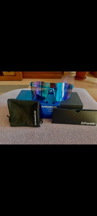 Gafas de sol D.Franklin para correr, nuevas a estrenar. Son de un azul precioso con un ligero efecto iridiscente. Modelo Tsunami Blue Chrome/ Ice Blue Revo - Montura ligera y cómoda. - Lentes de policarbonato. - Protección UV. - Incluye funda protectora y caja.