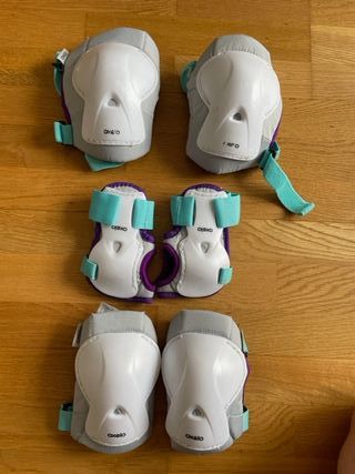 Kit de protecciones Oxelo para patinaje o ciclismo. Incluye rodilleras, coderas y muñequeras. - Diseño en color negro. - Cierre con velcro ajustable. - Incluye bolsa de malla para transporte. - Talla S. - Pequeñas marcas de desgaste por su uso. - Tengo 2 packs (10€ cada uno).