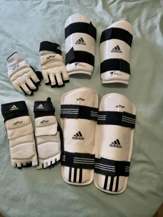 Conjunto de protecciones para taekwondo de la marca Adidas, con certificación WT. - Incluye guantes,empeines y espinilleras. - Color blanco con detalles en negro. - Cierre de velcro ajustable. -los empeines tienen algún roce y no son los electrónicos,son de entrenamiento talla 43 +/-