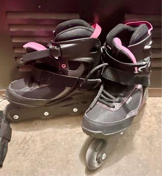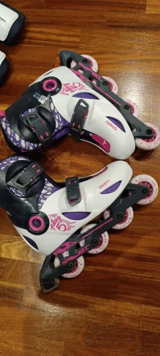 Se venden patines Oxelo en color rosa, talla 30-32. Incluyen protecciones y bolsa - Talla ajustable 30-32. - Color rosa y morado. - Incluye bolsa de red con protecciones (rodilleras, coderas y muñequeras). - Incluye bolsa para guardar patines