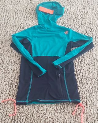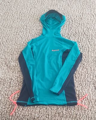 Camisa anti-UV UPF 50+ Manga Larga con Capucha Para Playa o Surf Lacitos dobles para asegurar la sujeción en las olas. Marca Olain (comprado en Decathlon) Talla XS, horma ajustado