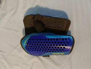 Protecciones para fútbol de la marca Mitre, modelo AirCell. - Diseño con patrón de hexágonos. - Color azul con detalles en turquesa. - Material ligero y transpirable.